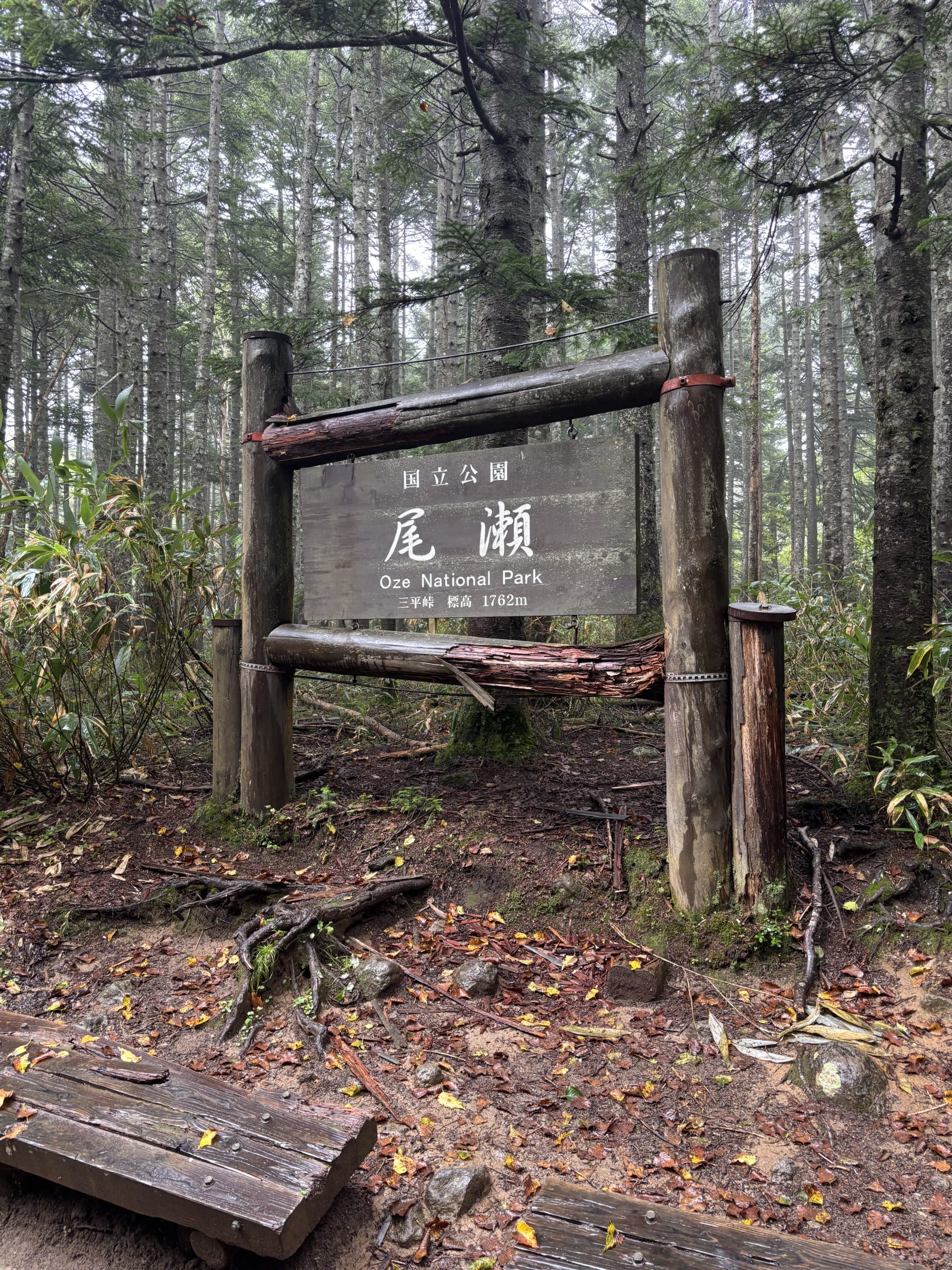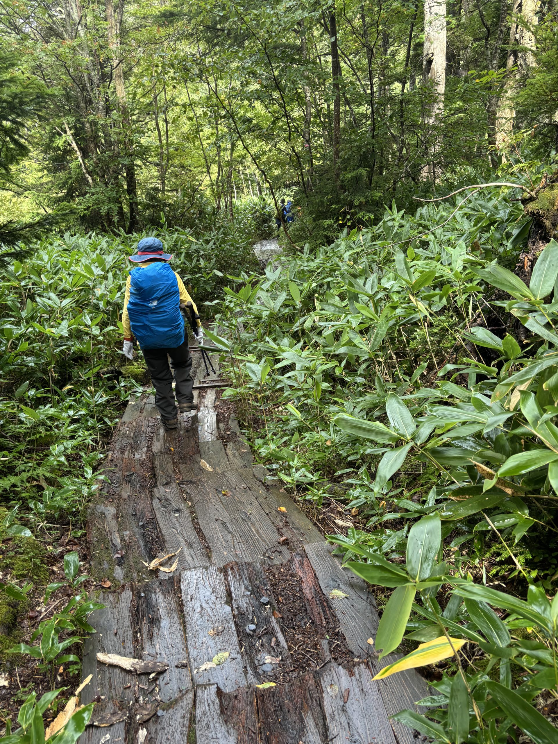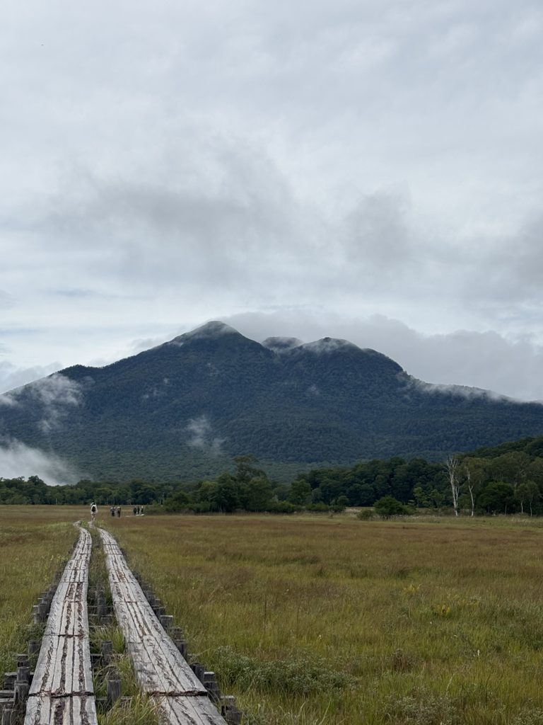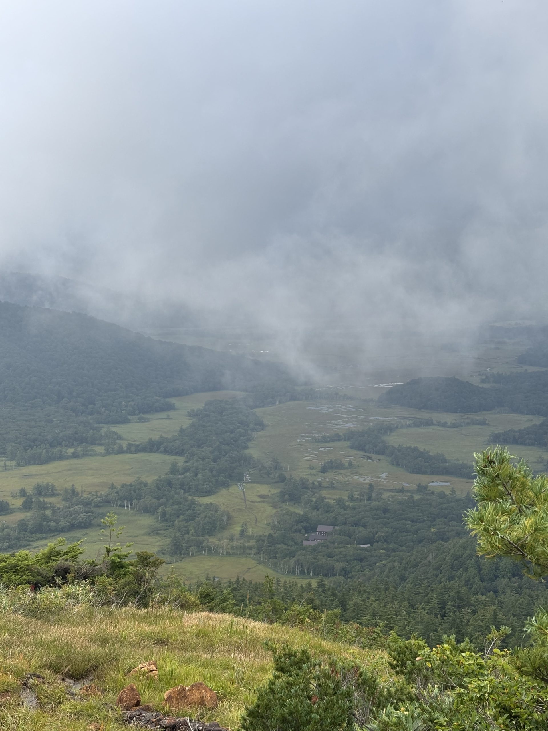 雨が止んだ8時に歩行スタート。時間に余裕があるので、のんびりと尾瀬の清々しい空気に浸りながら歩く。ガスの中の草木もまた幻想的でみずみずしい。