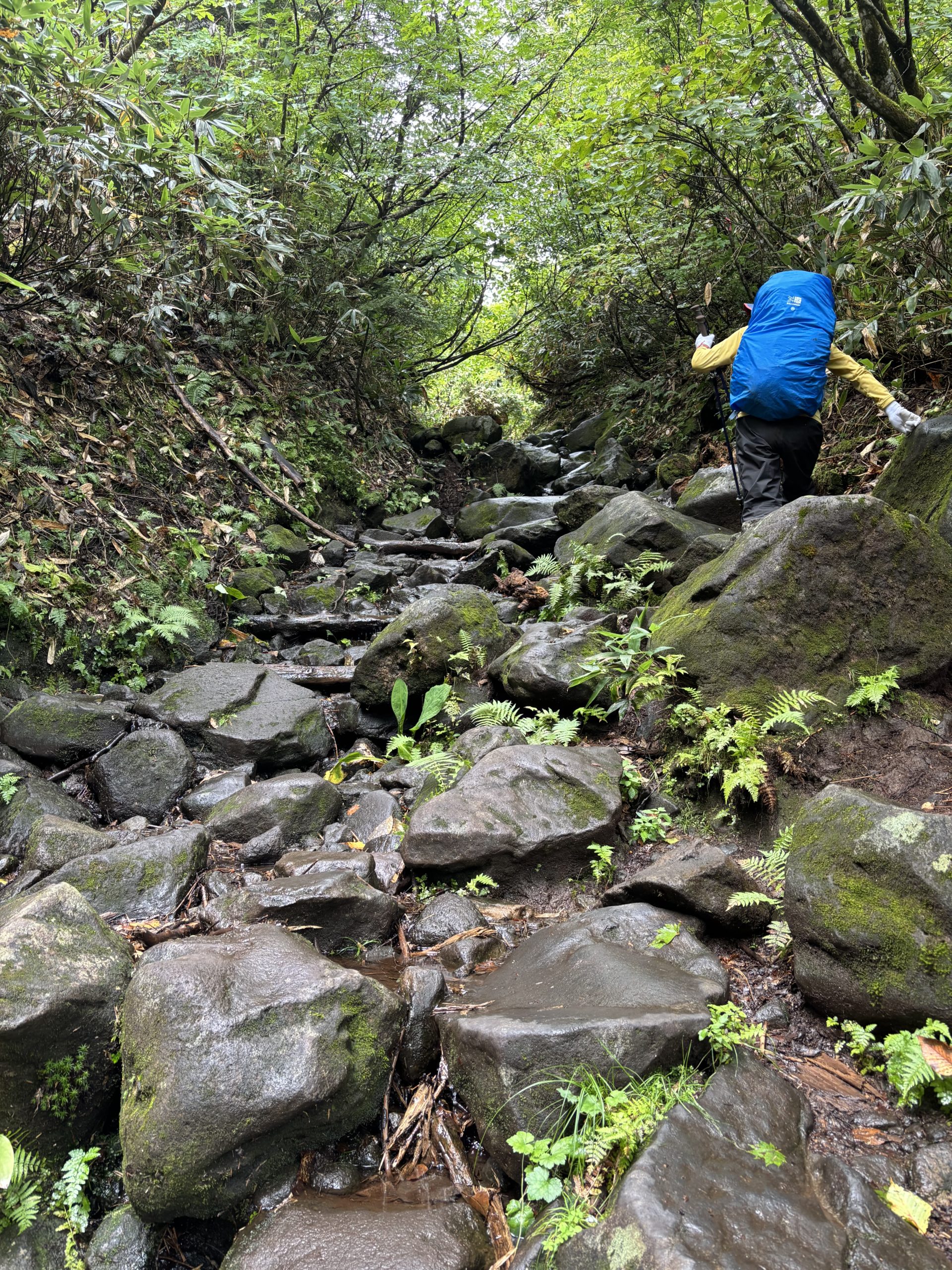 登り始めから急登が続き、ゴロゴロ石の階段には川のように水が流れる。
