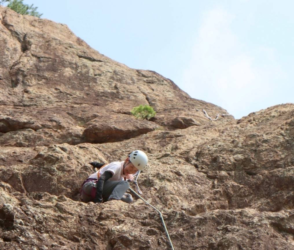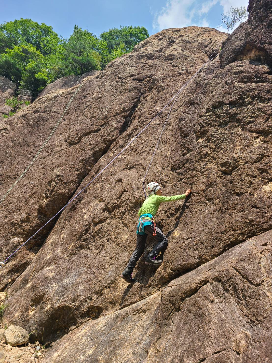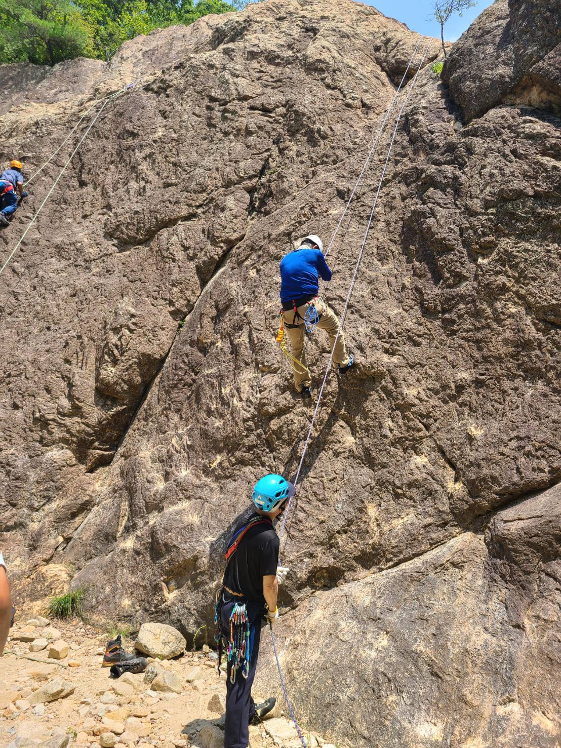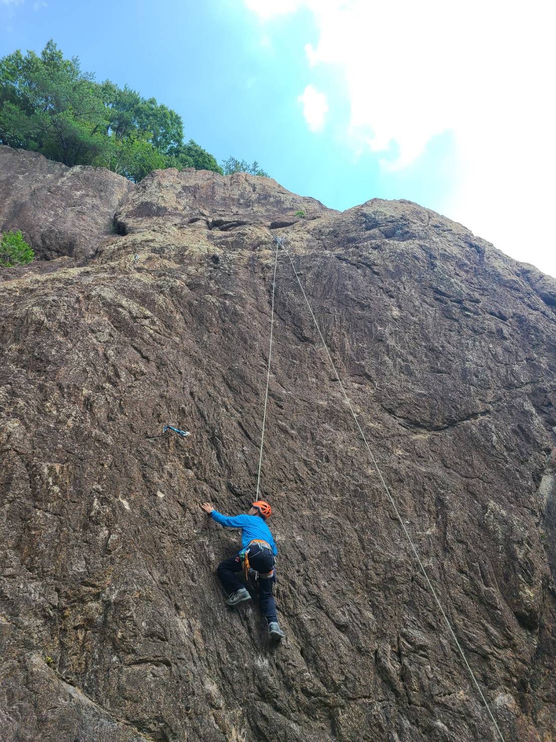 暑さのためか、いつもは岩壁面の取り合い(?)なのに今回は私達だけで独占。前回より難易度をあげ、助っ人もいたのでロープを2本たらしました。クレッターシューズ(室内クライミング用シューズ)で先ずは登りやすい岩場に取り付き登下降した後は同じ岩場を登山靴で再挑戦。次は違う岩場に同じように挑戦。