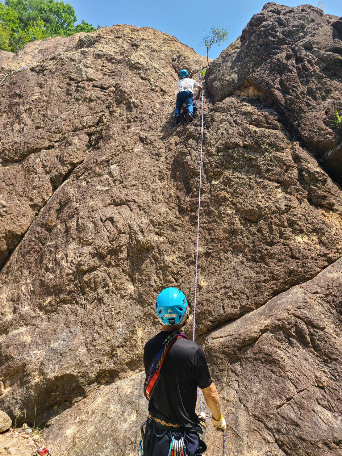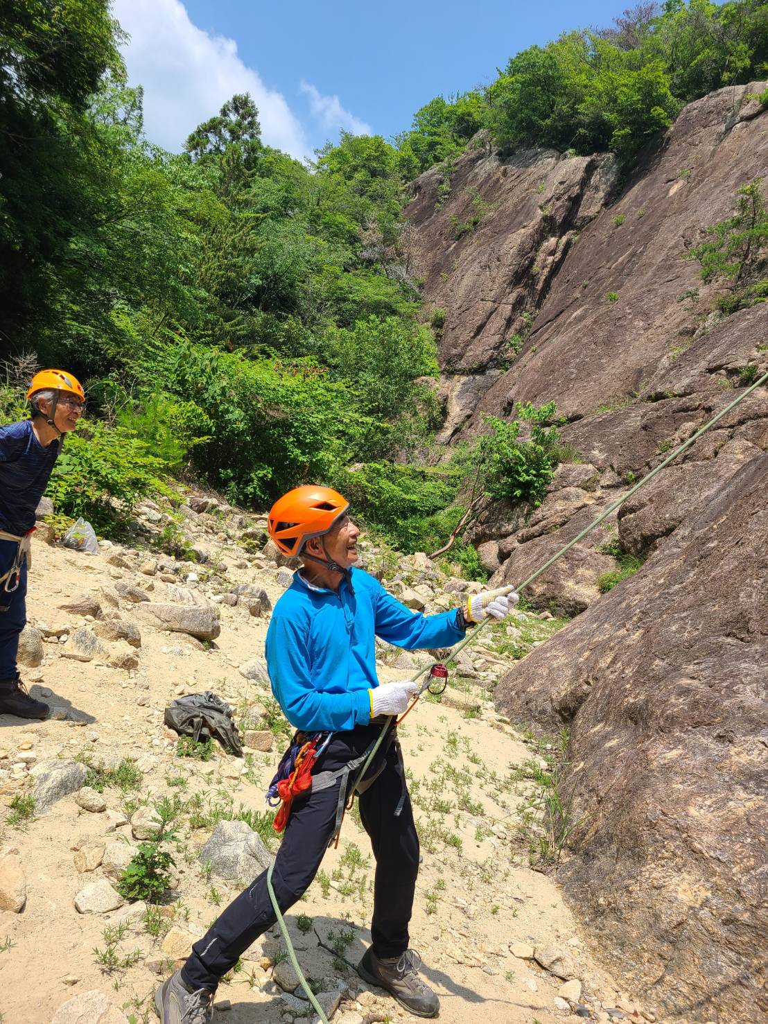 待機中は日陰に入り登攀者を観察・応援です。川辺りということもあり涼風も吹き、暑くなればタオル濡らしたりと独占状態を満喫しました。教育遭対部部員以外の助っ人の方にはいろいろお助けいただき有難うございました。