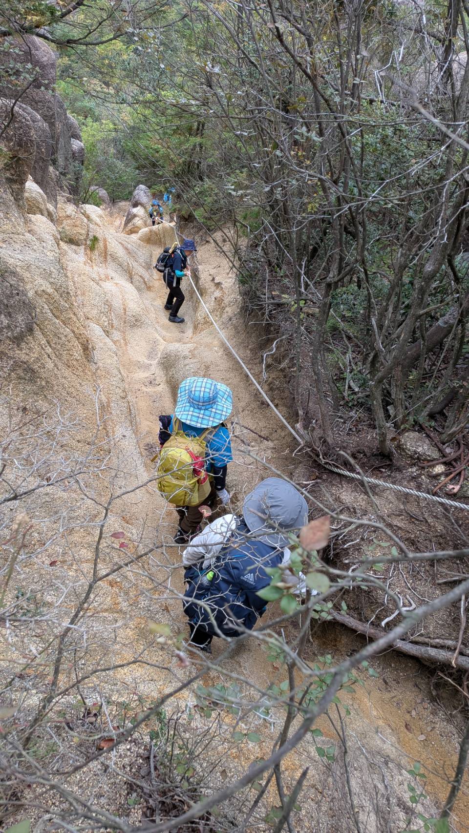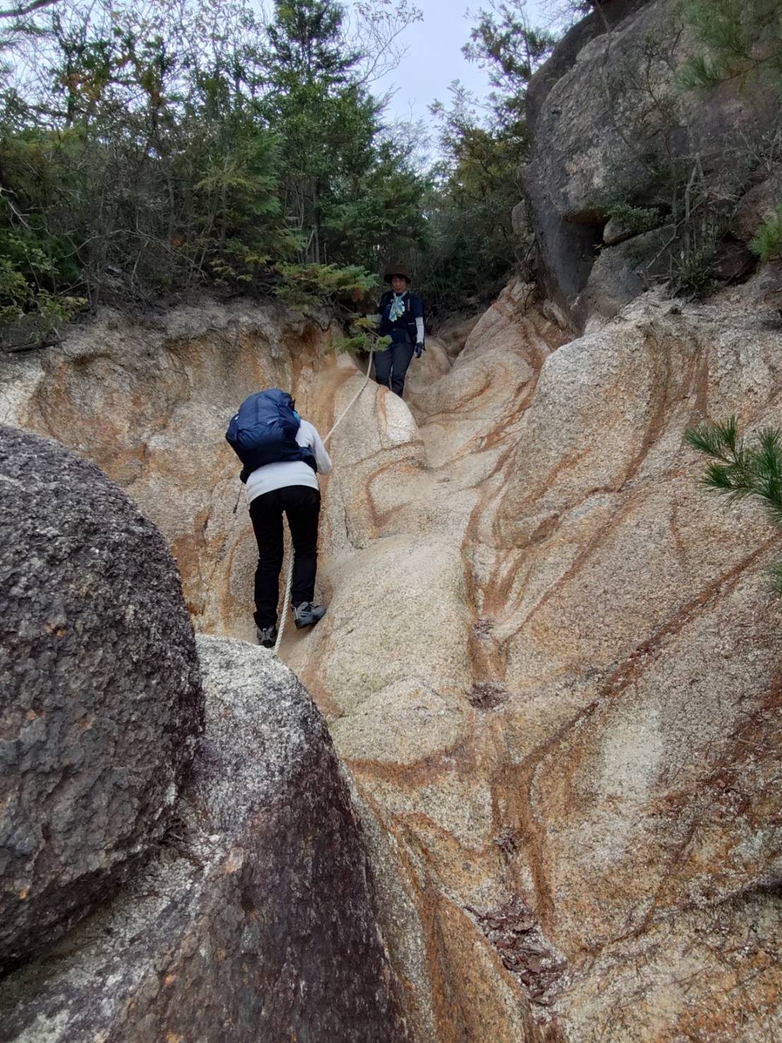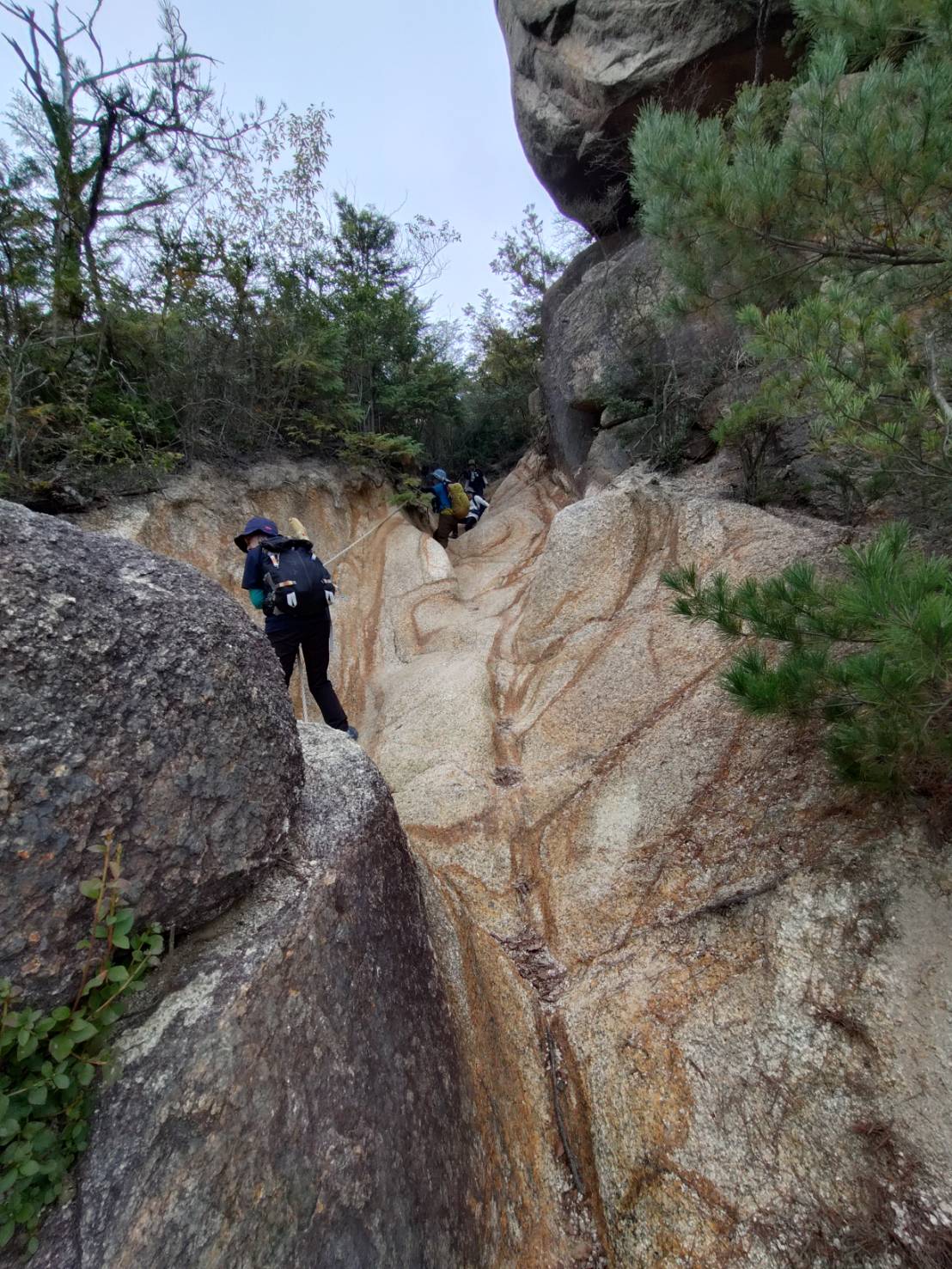 ロープがあったり岩と岩の挟まりそうな所を体を細めて通ったりと、アドベンチャーな道をキャッキャ言いながら下り、尾根沿いルートと谷沿いルートの分岐で谷沿いルートを選び、澄みきった水に泳ぐ魚を見つつ登山口に到着。
