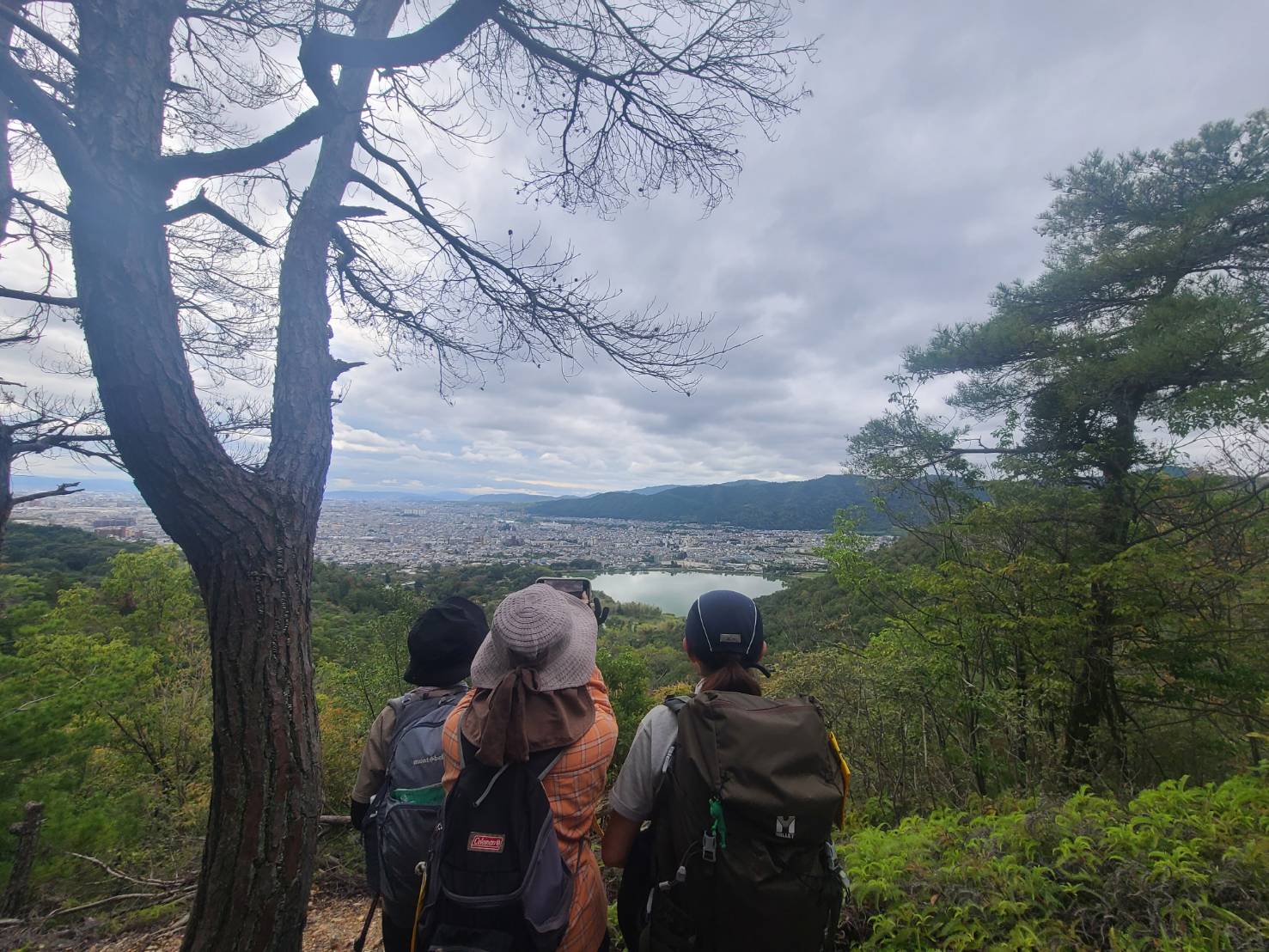 10月19日(日)7:45市役所に集合。市民17名の申込みがありましたが、朝雨模様のせいか3名の欠席がありました。会員1名,スタッフ4名、合計19名。阪急電車で嵐山へ、そしてバスで大覚寺まで行き9:45スタート。いきなりの急階段を登り嵯峨天皇陵へ。少し晴れ間も出て京都の町を見渡すことで疲れを癒やしながら山上稜に到着。菖蒲谷池では沢山の鴨が寄ってきて歓迎してくれました。長尾山の急坂を登り12時前頂上に到着、眼下に京都タワーを見ながらお弁当をいただきました。滑りそうな岩道を下り嵯峨富士へ。見晴らしもなく山頂をオーバーラン、慌てて引き返す。この下に展望の良い広場があり広沢池を山から見て下山。広沢池の前を歩いて今度は下から嵯峨富士を眺めました。コスモスが咲くのどかな田園迷路を通って大覚寺に戻りました。山中の分岐などではYAMAPを見て進む方向を確認しながら歩きました。午後3:03のバスで阪急嵐山に戻り「また市民ハイクで再会しよう」と散会しました。
