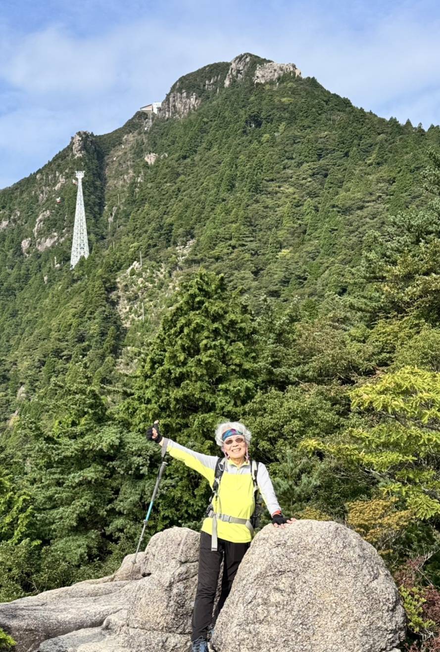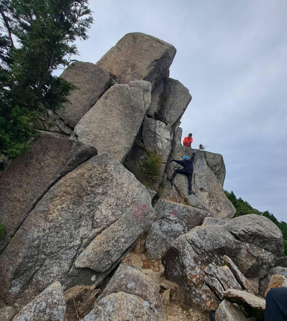 崩落した「オバレ石」は少し傾きロープが張られているが姿にあまり変わりはない。奇岩の数々を楽しみ名物岩、地蔵岩を見上げていると…裸足にサンダル履きの男性があっという間にスルスルと地蔵岩テッペンに。ビックリして思わずパチリ。登るより下りが恐いなぁ~と言いながら降りた強者は風のごとく立ち去った。刺激と勇気を貰いキレットや数々の岩場、鎖場をクリアし大岩前で休憩していると、またまた若者が垂直に近い大岩壁をヤモリの如くロープ無しで登る。