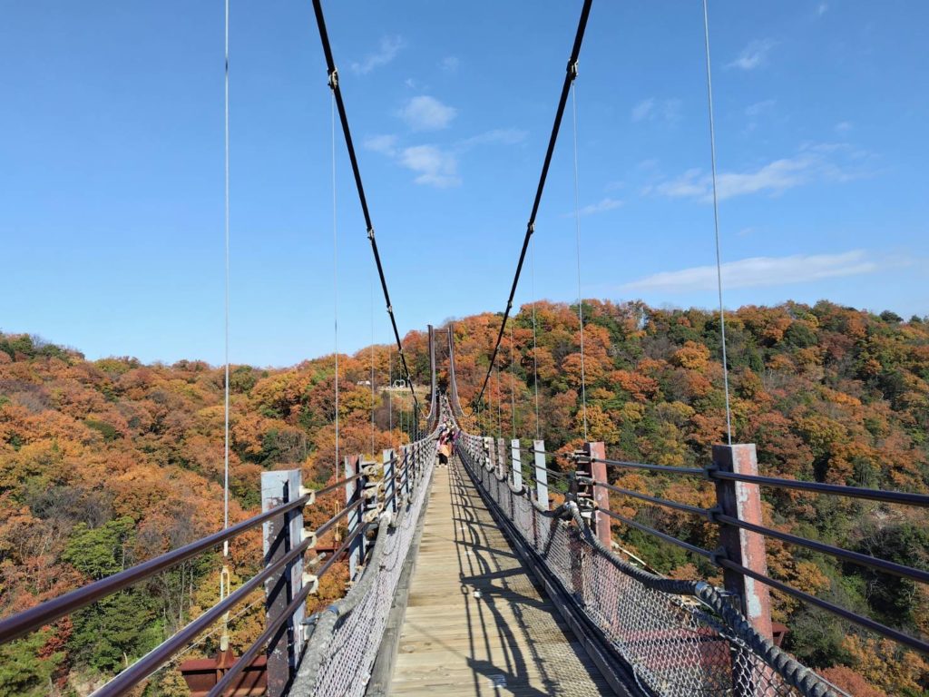 ほしだ園地に入ると沢山の人で賑わっていて、可愛いムラサキシキブの実が見られました。 全長280m、最大地上高50mの星のブランコから眺める景色は紅葉がとても綺麗。揺れを感じ、スリルを味わいながら快晴の空中散歩を楽しみました。