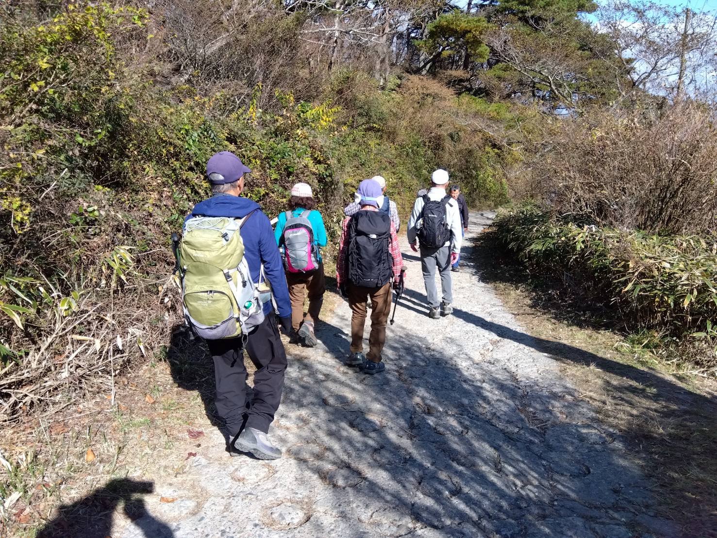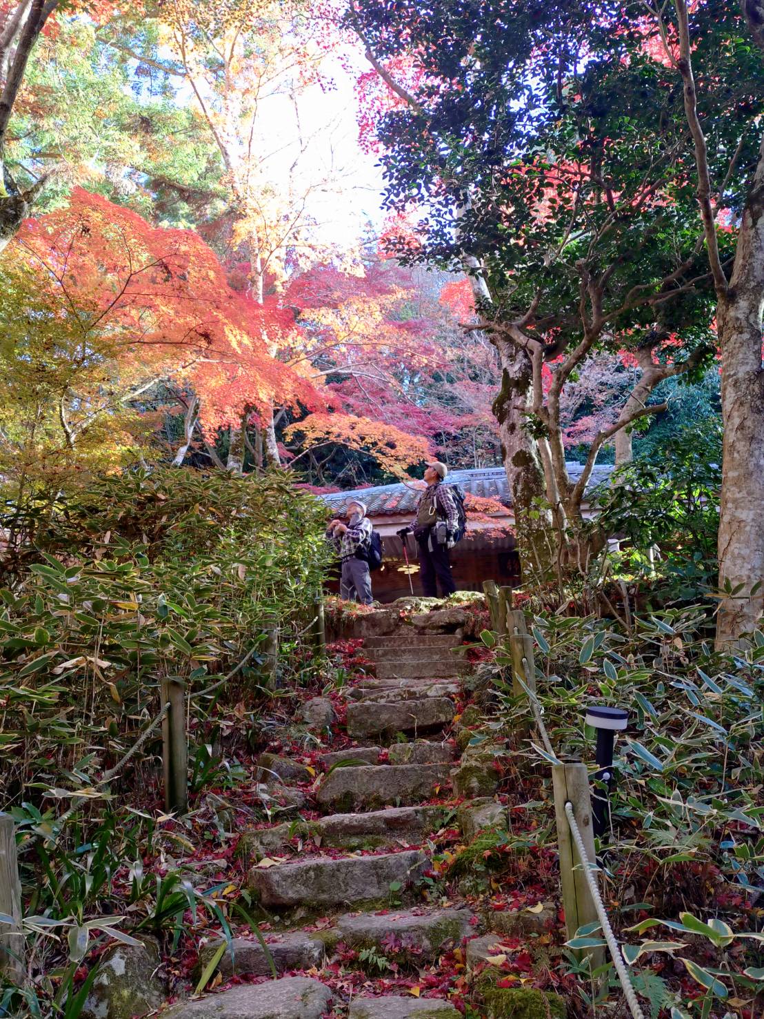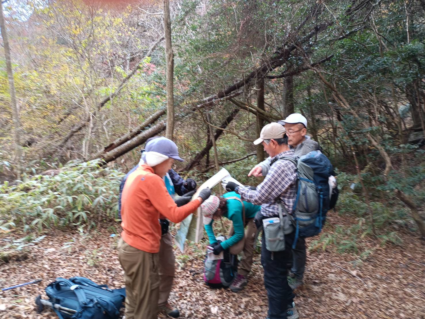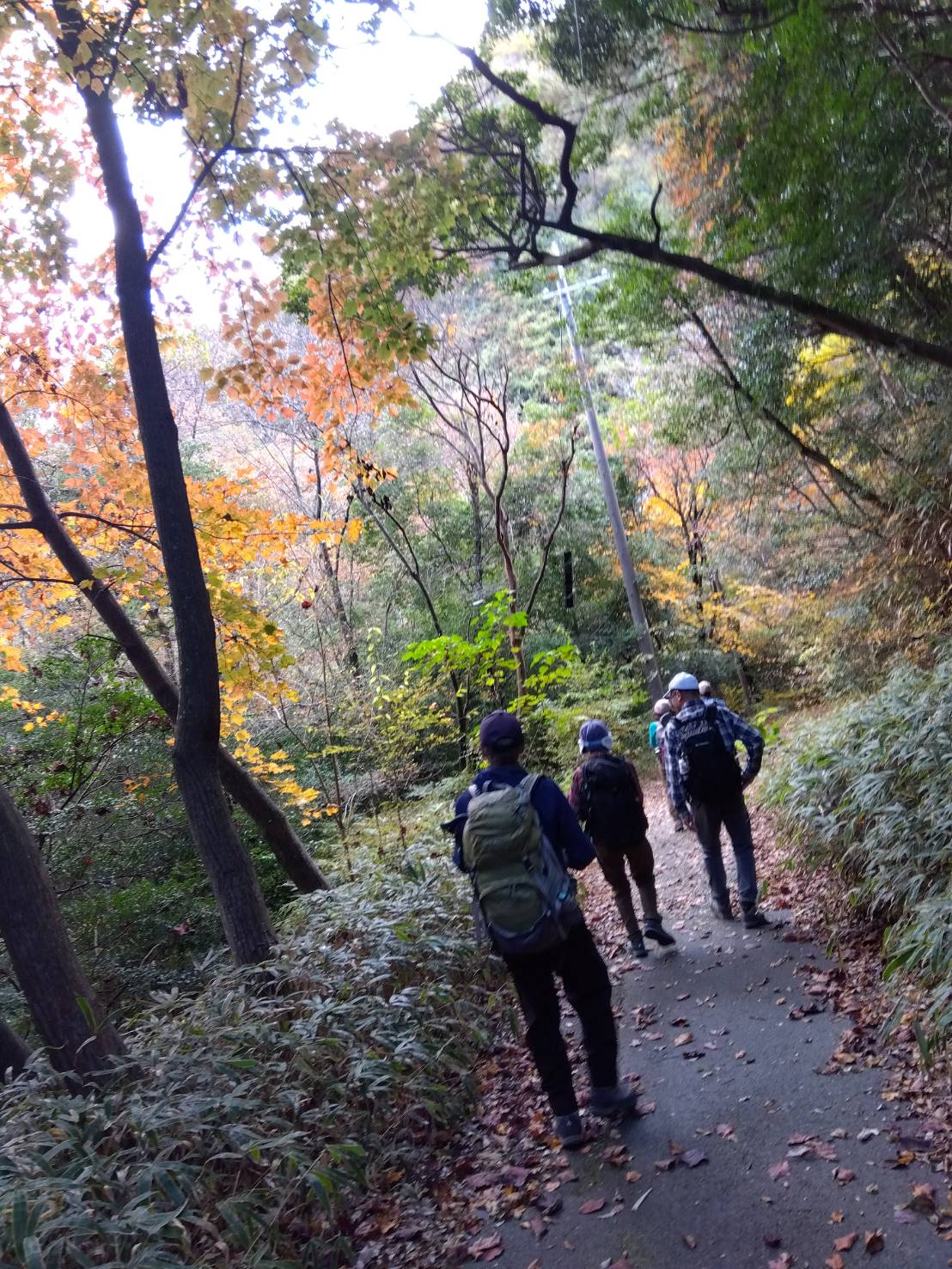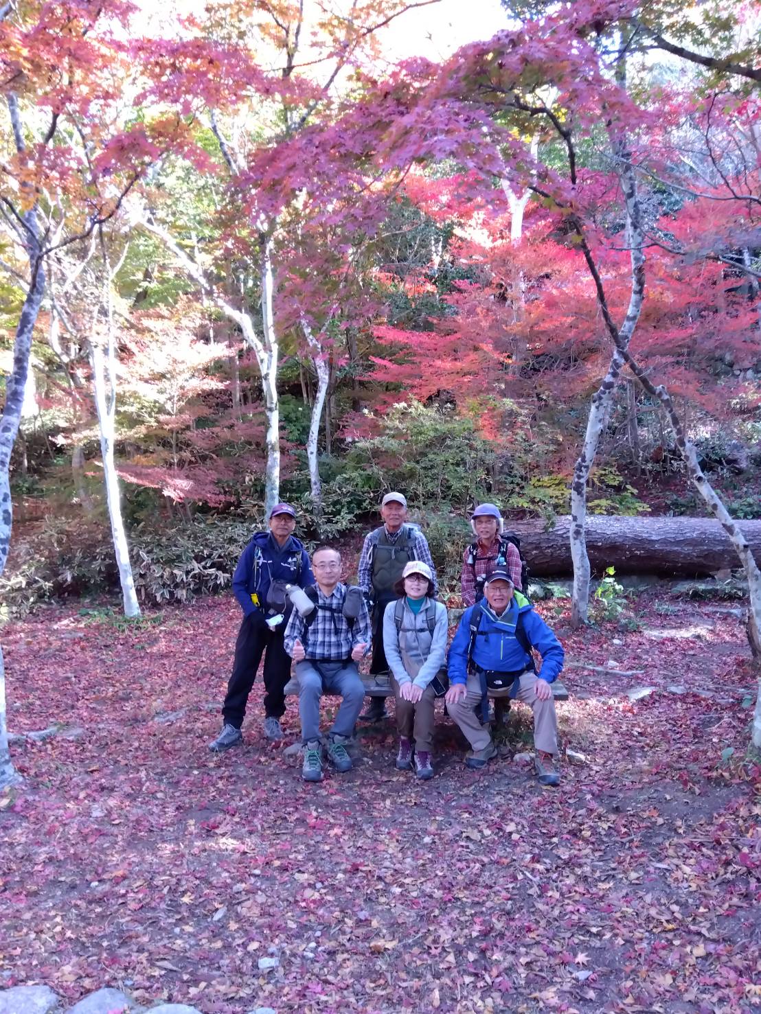 瑞宝寺公園は圧倒されるような見事な紅葉であった。しばらく紅葉を楽しみ瑞宝寺谷に入る。渡渉、堰堤を繰り返すも紅葉が綺麗。昼食後頂上へ。下山は石の宝殿の手前から「おこもり谷」を下る。あまり知られていないコースで笹に覆われ入り口が分かりにくい。踏み後も少なく気が抜けない。たまにあるテープを頼りに、土樋割峠に着く。休憩後足取りも軽くバス停に向かう。紅葉を一日中満喫した山行でした。皆さん、お疲れ様でした。