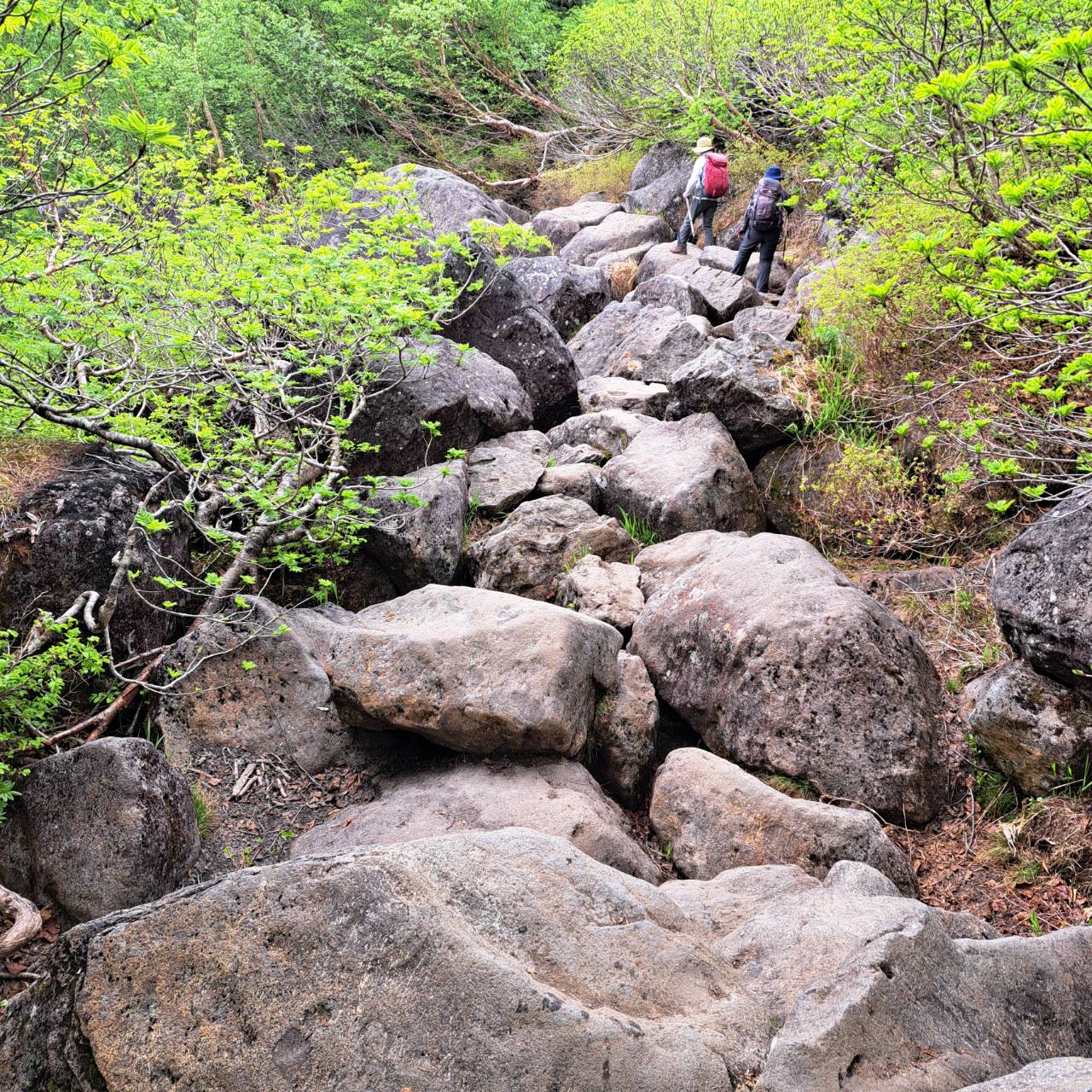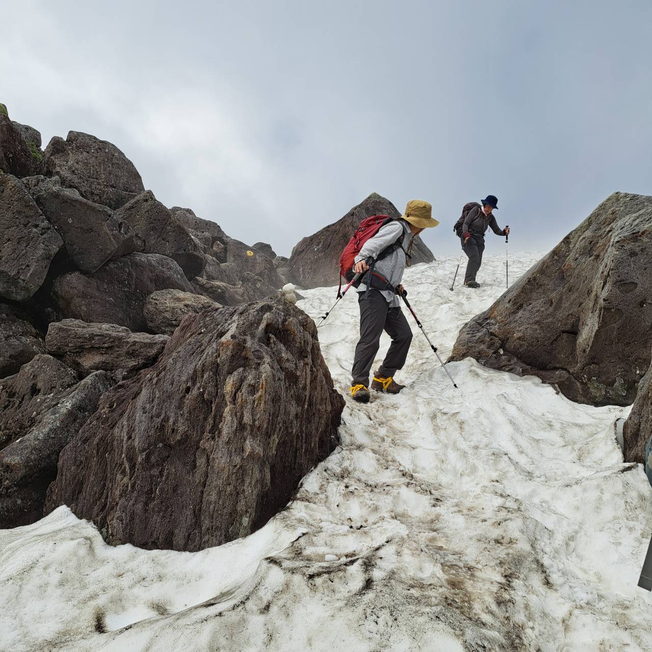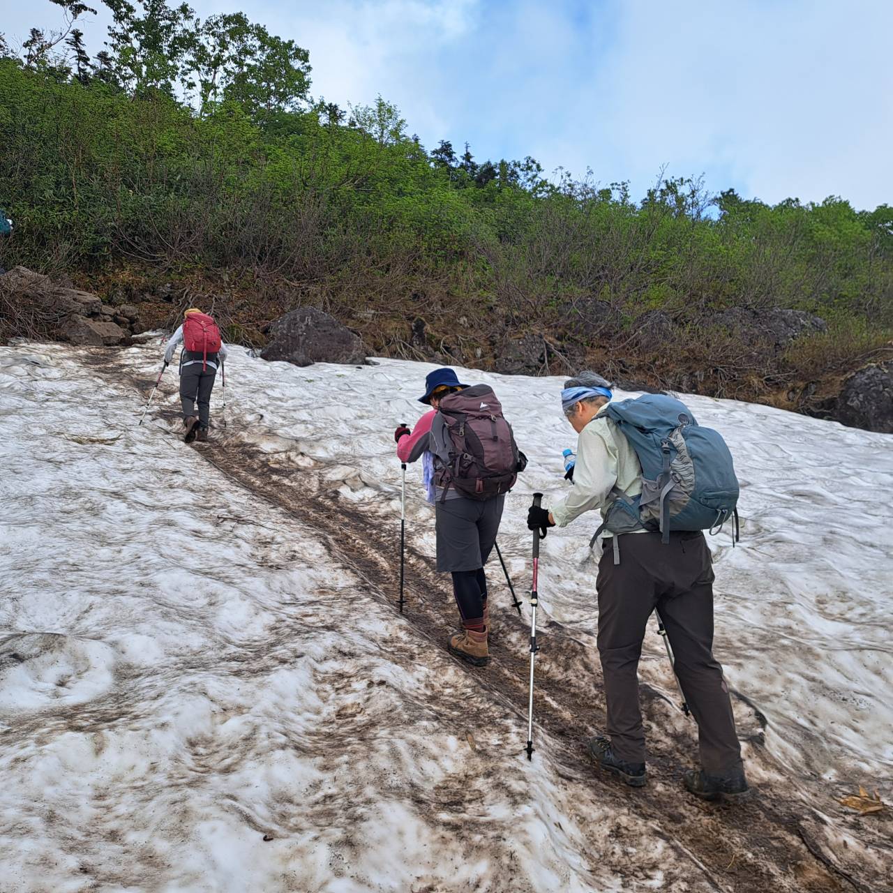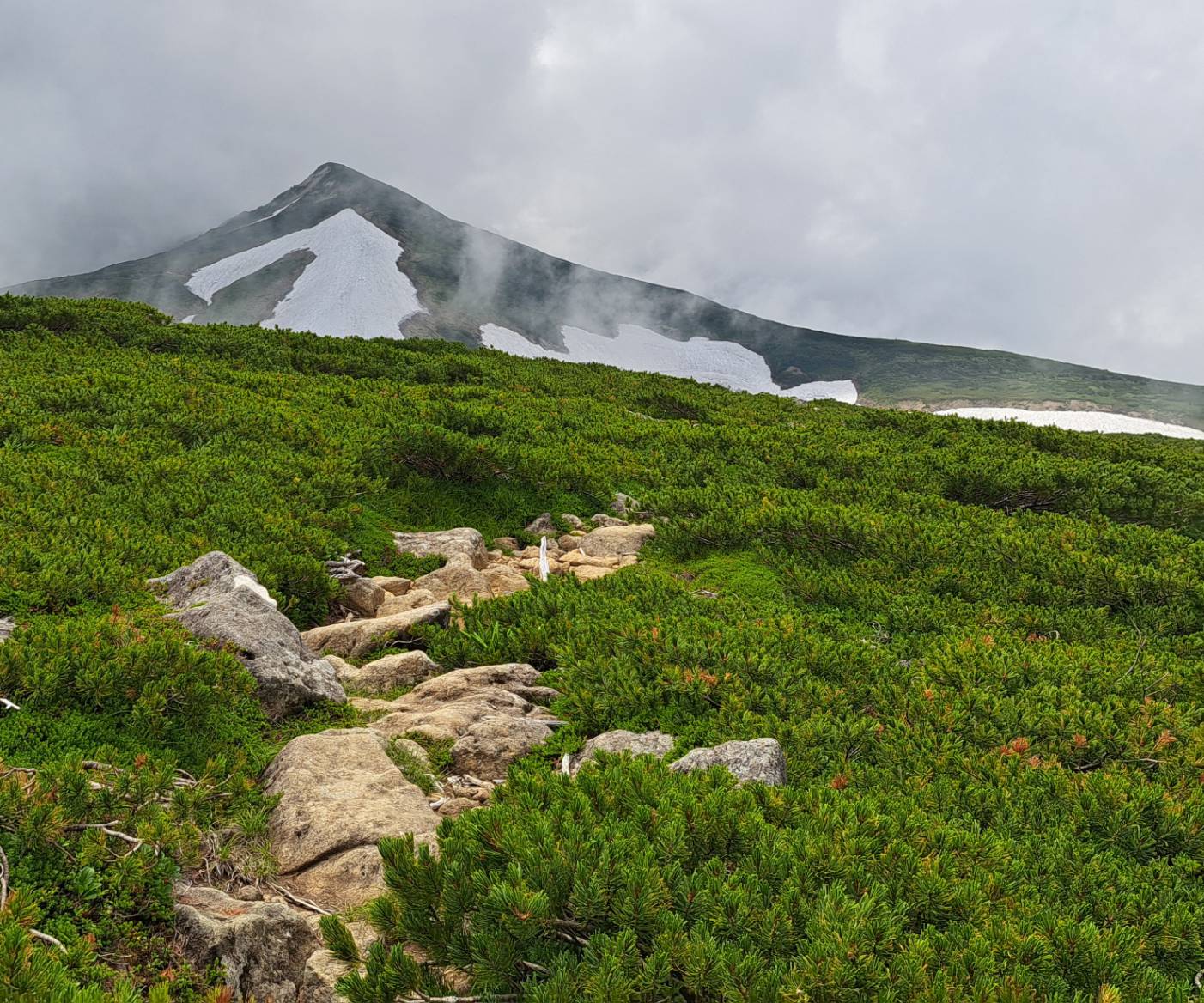22日:オオシラビソからダテカンバに代わり岩場歩きになり「天狗原」着。雪渓渡る風が涼しい。