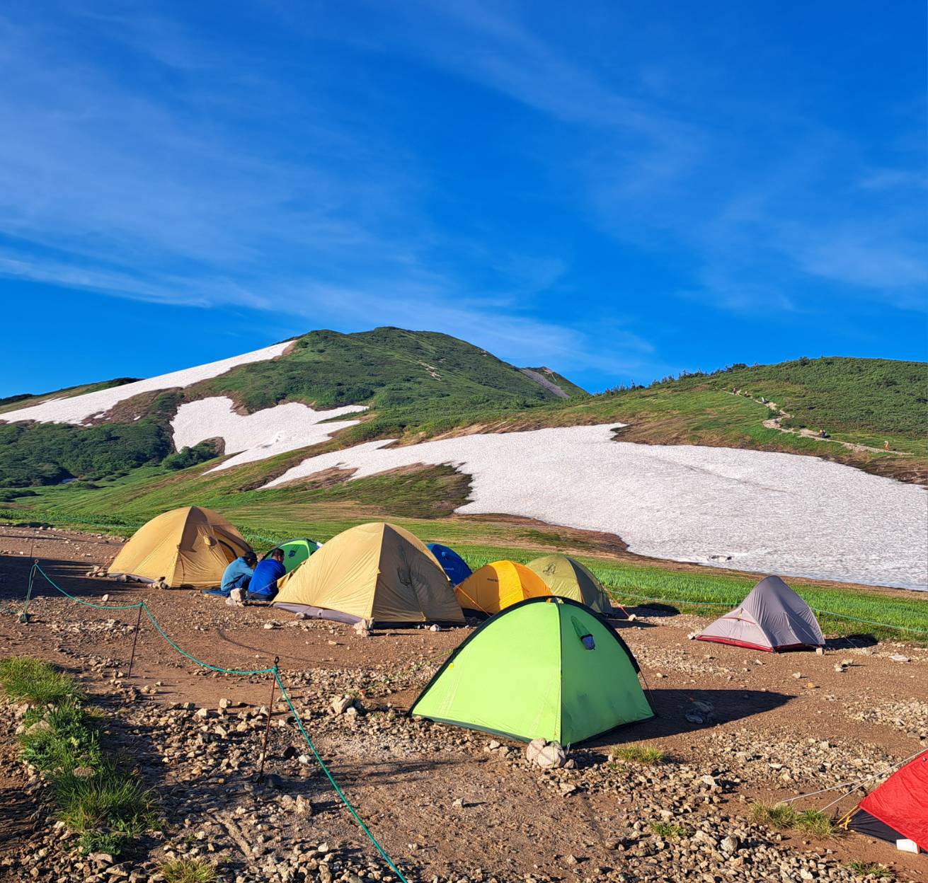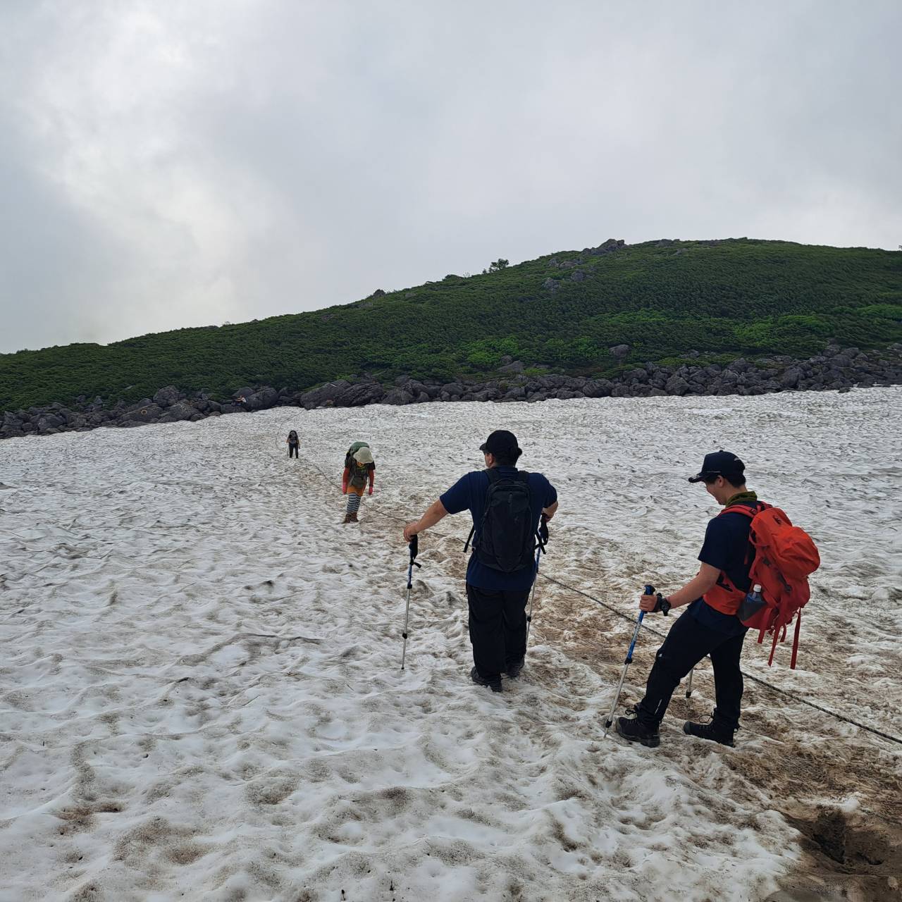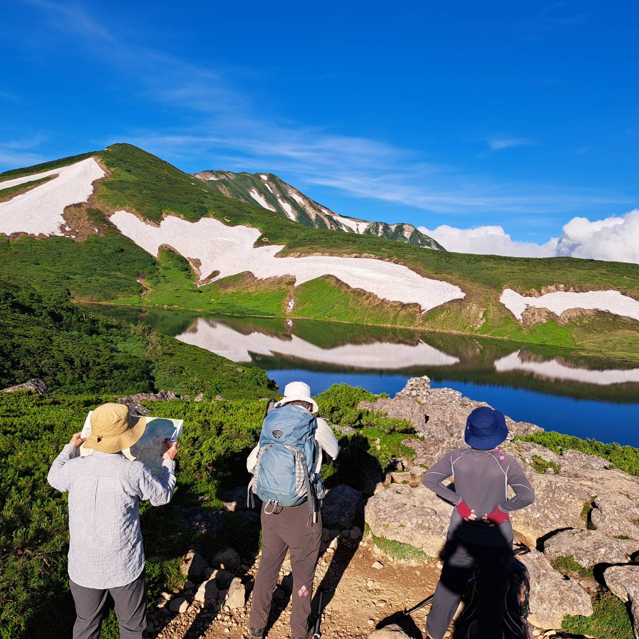 23日:天気は☀☀ 青空と雪渓 ! 白馬への稜線。足元は色々な高山植物。来て良かった~と。白馬乗鞍岳からは昨日は見えなかった白馬稜線の数々のピークの向こうに「白馬岳山頂」が・・・✌ 岩がらみ登山道が苦手な人もコツを掴んだようで、スムーズに岩場歩きや雪渓歩きをこなす。登りより下りを心配したが、皆の協力で予定より早く栂池自然園に下山。