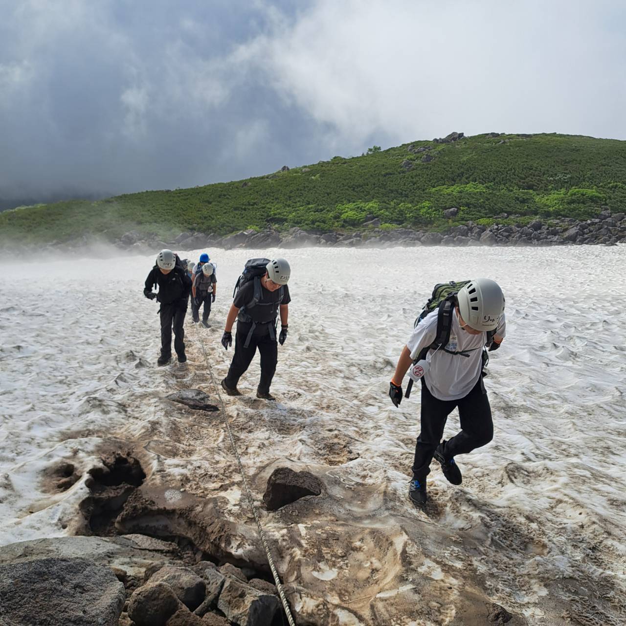 ここからは本格的な岩稜帯歩きと雪渓 !! 雪渓が解けたとは言え斜度も有る長い雪渓。ロープを持ち慎重にクリアー。フラットな歩き易くなるころ天を衝く大ケルン「白馬乗鞍岳」山頂着。ここから見る景色は最高! 何度見ても素晴らしい。白馬大池越しに残雪まぶしい船越の頭~小蓮華稜線が見事!! ※ 因みに「坂の上の雲」エンディングの景色である。